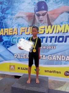 Muhamad Putra, siswa kelas IV SDN 3 Kaduagung Timur menyabet medali emas dalam gelaran Area Fun Swiming...